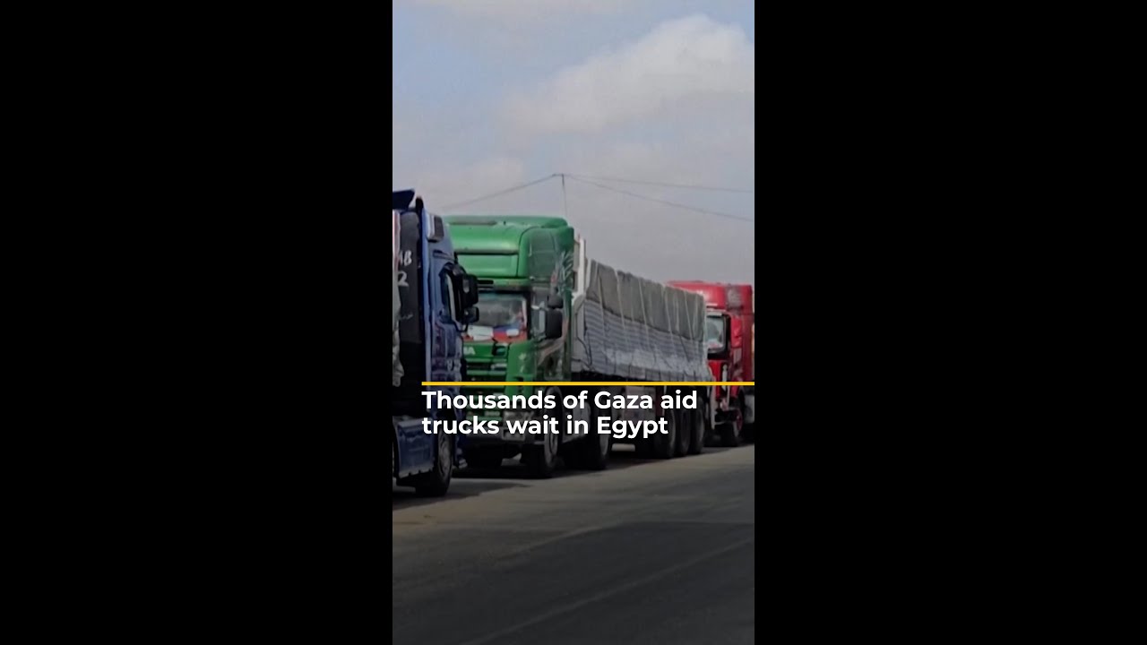 Video shows some of the thousands of aid trucks that officials say are stuck in Egypt as Israel continues to block supplies getting into Gaza.